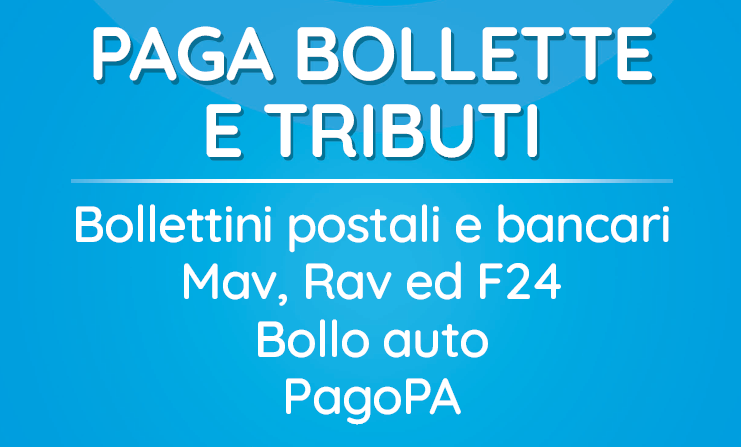 Paga Bollette, Tributi e servizi in pochi minuti, senza file e senza stress. Bollettini, MAV, RAV, F24, PagoPA, Bollo Auto (anche arretrati), Ricariche Postepay e Telefoniche, Spedizioni in Italia e all' Estero. Servizio Rapido, assistenza reale e zero errori: Pensiamo a tutto noi.
